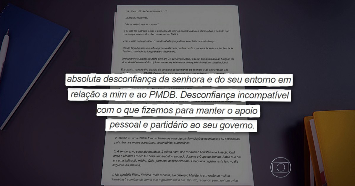 Ele lista episódios que demonstrariam ‘desconfiança’ da presidente. Assessoria do vice disse que ele se surpreendeu com divulgação da carta.